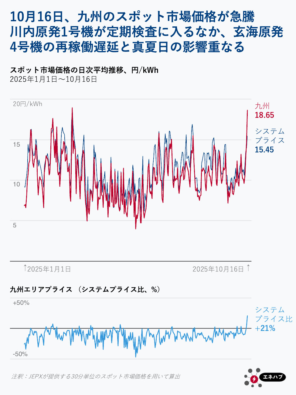 供給力の低下と季節外れの真夏日の影響が重なったことで、10月16日受け渡しの日本卸電力取引所(JEPX)スポット市場における九州エリアプライスは平均18.65円/kWhに上昇し、今年に入って2番目の高値を記録した。さらに、全国平均(システムプライス)を21%上回り、2021年半ば以降で2番目に大きな価格差となった。
